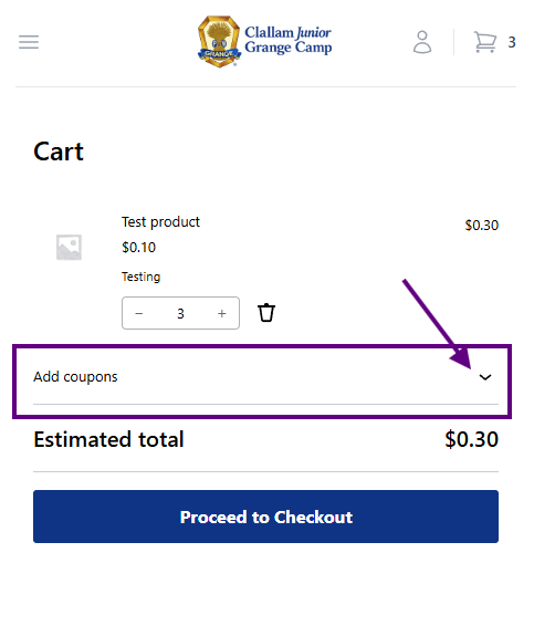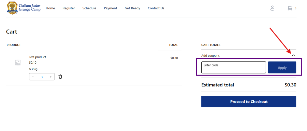 On the cart page or checkout page, there will be a small box that is labeled “Add Coupons” – this is where you will add in the provided code. Each code will be unique and generated for each camper.